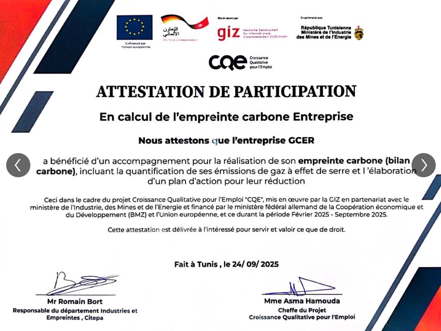 Fidèle à sa vision d’une industrie responsable et durable, GCER a franchi une étape déterminante dans sa démarche environnementale en s’engageant dans le programme national d’appui au calcul de l’empreinte carbone, une initiative pilotée par la GIZ Tunisie, en partenariat avec le Ministère de l’Industrie, des Mines et de l’Énergie, et financée conjointement par le BMZ (ministère fédéral allemand de la Coopération économique et du Développement) et l’Union européenne.
